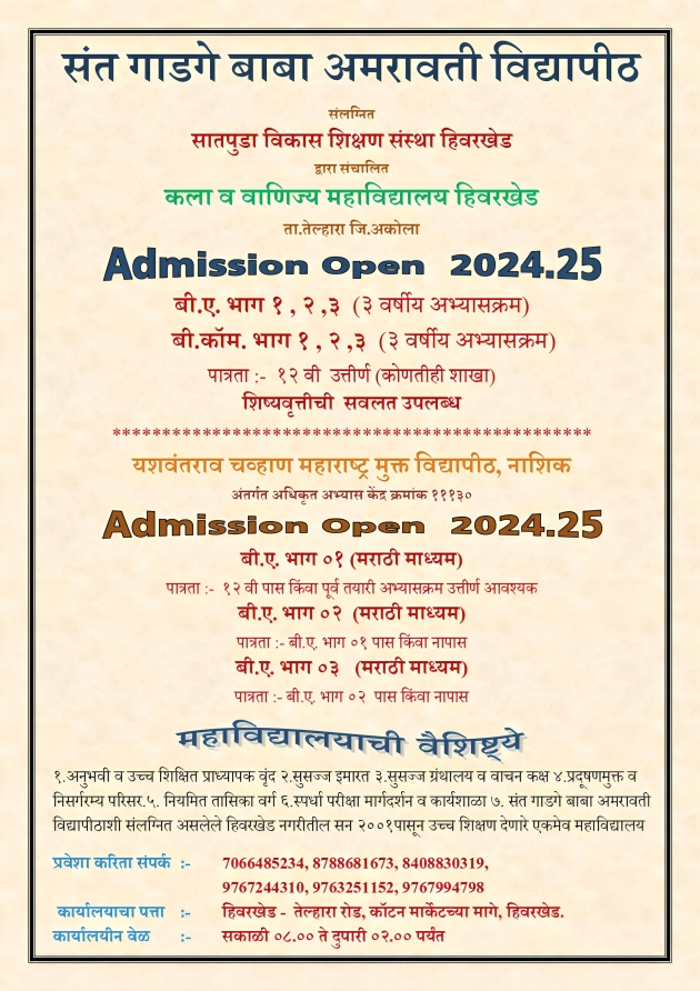 I am very much pleased to state that Satpuda Shikshan Santha, Hiwarkhed established a Kala va Vanijya Mahavidyalaya, Hiwarkhed college in 2001 at Hiwarkhed with a vision to provide an educational platform for students belonging to various socially and economically weaker sections.